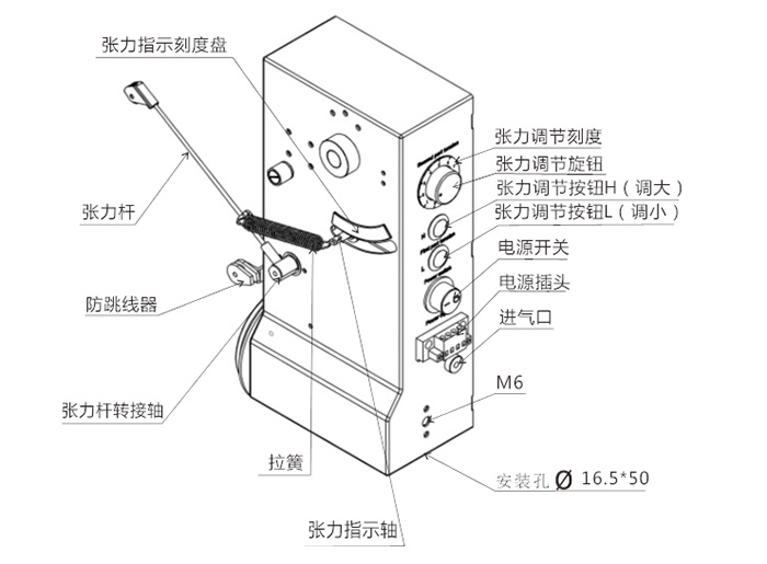 3、通过进气口(lnlet)接通气源,气源气压不得超出0.6mpa(接入气管规格:Φ4mm)。在旋转张力调节旋钮之前,务必关闭气源,让气缸处于复位状态。
