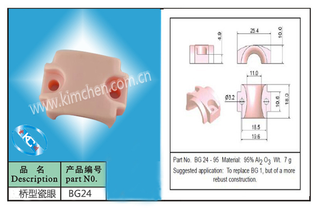 陶瓷瓷眼:桥型瓷眼BG24属于陶瓷瓷眼一种,应用于绕线机及纺织机械中的过丝部位,是最常用的过丝另件,用于要求不高的过丝场合。工作时,丝线在瓷眼表面滑动,为了降低摩擦力,必须提高材料的硬度,光洁度及形状。本公司选用99%的Al2O3,硬度大于HRa88,密度3.85,超精抛Ra0.2。