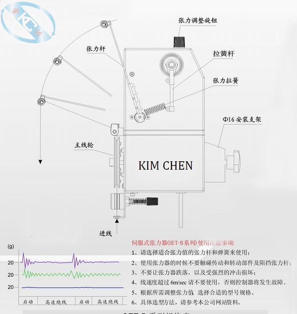 SET-B伺服张力器由传统的被动送线方式改变为主动送线方式,与机械张力器、磁力张力器相比张力特别稳定,其张力值范围为1g—200g并自带反溃张力稳定系统,能自动实现张力稳定平衡。因控制器和马达驱动装置都在内部,使张力器本身紧巧化,只需从外部供给24V电源,就可使此运转,可根据客户要求提供断线检测功能版本。