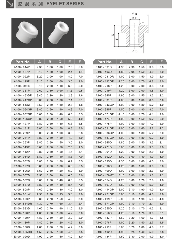 The alumia ceramic (Textile ceramic eyelet) Zirconia ceramic eyelet is used to set less (friction is also less) location of pressure right. For cost reduction , according to using a request, smoothness polishing handicraft is allotted being (0.8 throw Ra) roughly , is throw (Ra accurate 0.4), surpasses essence throwing (Ra0.2). Be that single face is super-accurate at the same time mark throw and two-sided super-accurate throw. Specification of china eye many, select and use specification listing in common use in sopport a customer the day afer tomorrow now, also may demand making to order according to the customer.