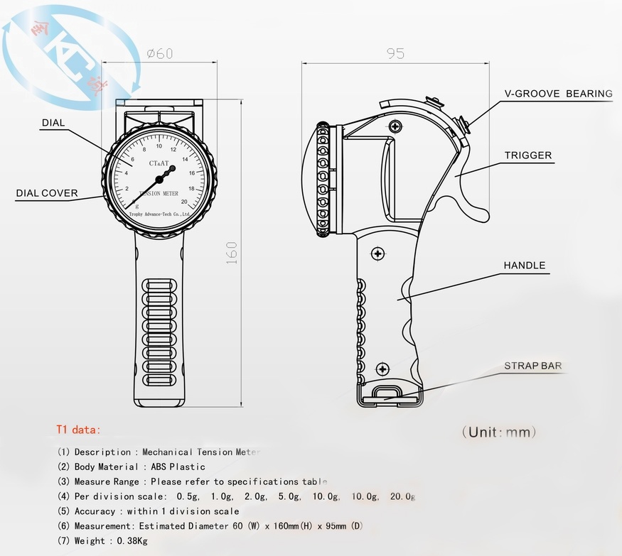 Mechanical Tension Meter T1 Series are for accurately measuring the running line tensions on all kinds of wires (cooper,metal,aluminum,plastic and etc).yarns and fibers.With precise jeweled(Ruby bushing) movement,Precision ball bearing mounted rollers and built-in damper,T1 tension meter completely eliminate the vibration and resistance caused by instrument itself,to provide reliable,accurate and steady tension reading as tension fluctuate.